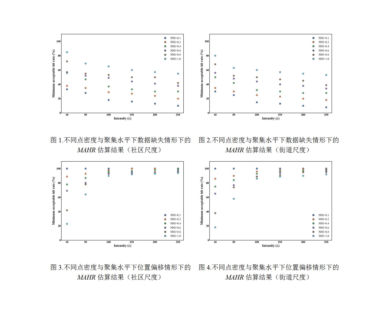 1)在存在地址遗漏的情形下,当事件点密度较低或聚集程度较高时,MAHR可低至80%以下即可维持原始空间分布特征;而在点密度升高时,MAHR标准随之提高。